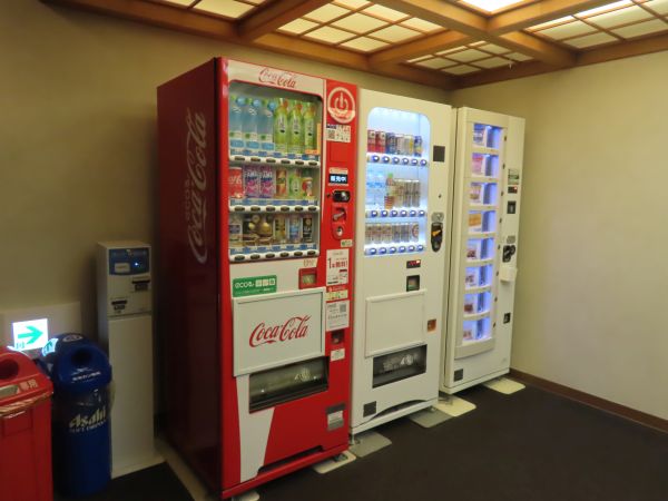 2階のエレベータホールには自動販売機があり、アルコール類やカップ麺も売られている。