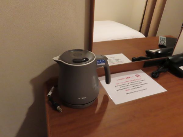 机の上に湯沸かし器がある。