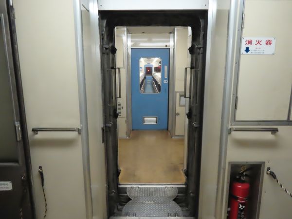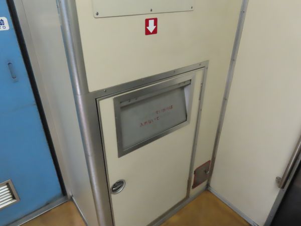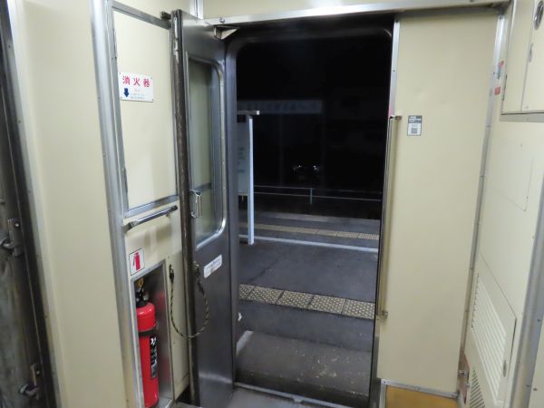 デッキ部分を見る。この車両には、この区間を運行するほかの普通列車用車両と同じく、トイレは設置されていない。一部の駅では行き違いで長時間停車をするので、その時間で駅のトイレを使うことになる。
