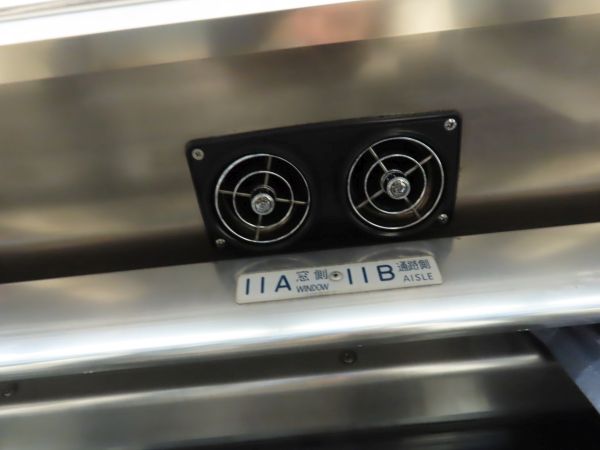 時代を感じさせる冷房の吹き出し口があり、その下には特急時代の名残か、座席番号が書かれたパネルがある。
