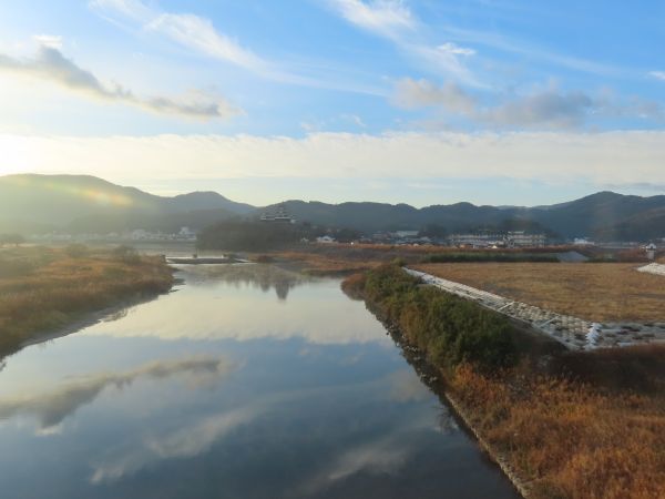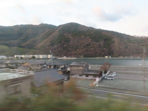 伊予大洲を出ると、肱川を渡る。進行方向左側を見ると、向こう側に大洲城がある。