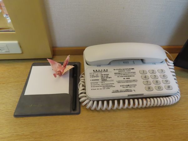 机上の電話の横のメモ用紙には折り鶴が置かれていた。
