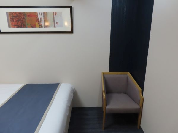 ベッドの脇にソファーがポツンとある。丸テーブルくらいあっても良いのではと思う。
