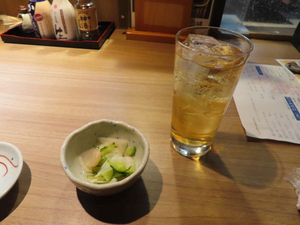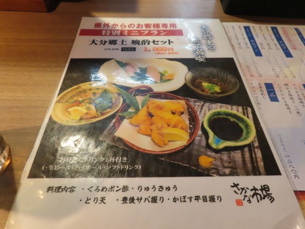 くろめポン酢、りゅうきゅう、とり天、豊後サバ握り、かぼす平目握りのセットであった。美味しくいただいた。この日は年末ということで10%の追加料金がかかり、計2,613円であった。