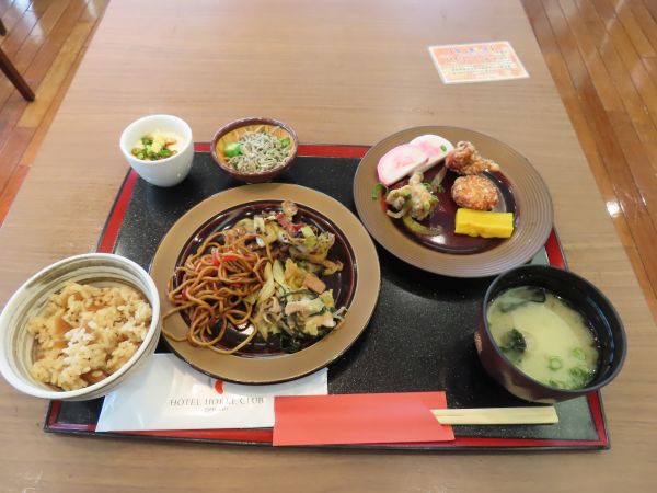 正月ということで、通常のメニューのほかに、お雑煮やかまぼこなどの正月料理のコーナーもあった。とはいえ、大分に来たということで、中津からあげ、日田焼きそばなど、大分料理を中心にいただいた。