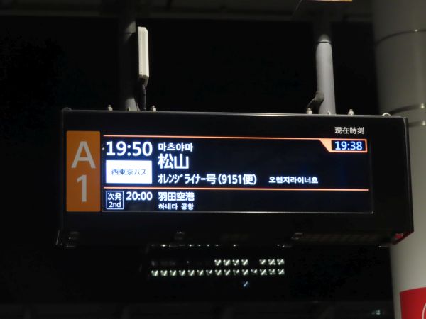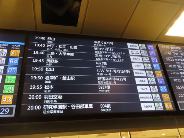 まだ昼行バスの出発が多い時間帯であり、バスタ新宿から19時台に出発する夜行バスは、おそらく19時40分のWILLER EXPRESS運行の米子・松江・出雲市行きと、19時50分のオレンジライナー号松山行きのみである。