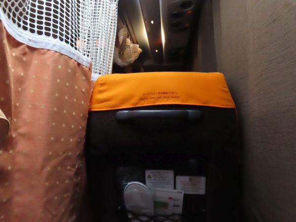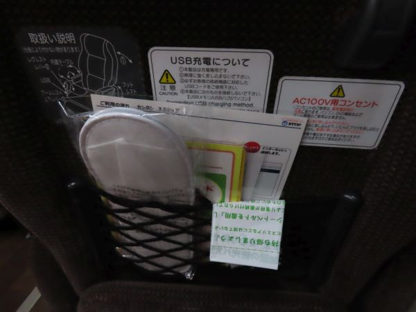 座席前のポケットには、ごみ袋、使い捨てスリッパが予め入れられている。また、車内でのWi-Fiの使用が可能であり、その案内もあった。