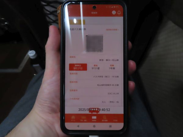 2025年9月27日土曜日。19時50分にバスタ新宿を出発する松山行きに乗車する。今回はハイウェイバスドットコムで、新宿から松山室町営業所までの乗車券を購入した。12,300円であった。