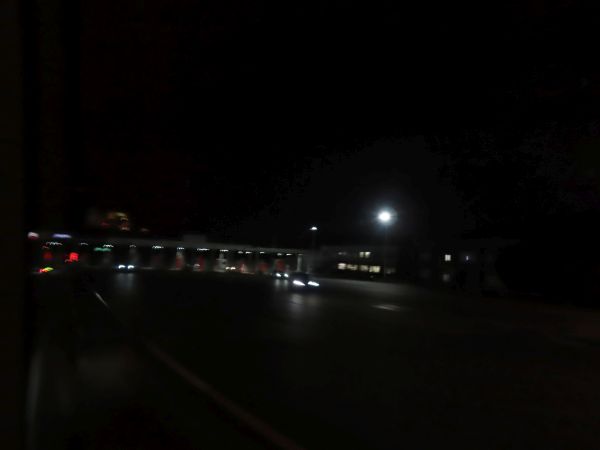 出発前に22時に消灯する旨の案内がある。21時35分、運転席後ろの仕切りカーテンが閉められ、バスは出発した。21時55分に少し暗くなり、22時、完全に消灯となった。