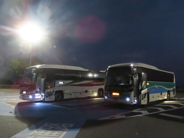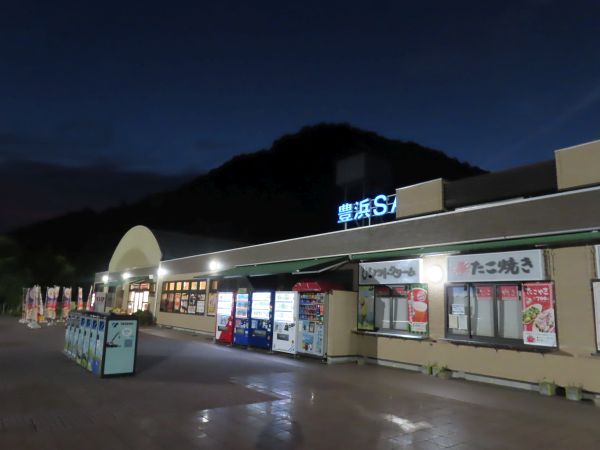 5時20分、香川県観音寺市にある高松自動車道の豊浜SAに到着した。ここで放送が入り、車内の照明も点灯し、15分休憩となる。