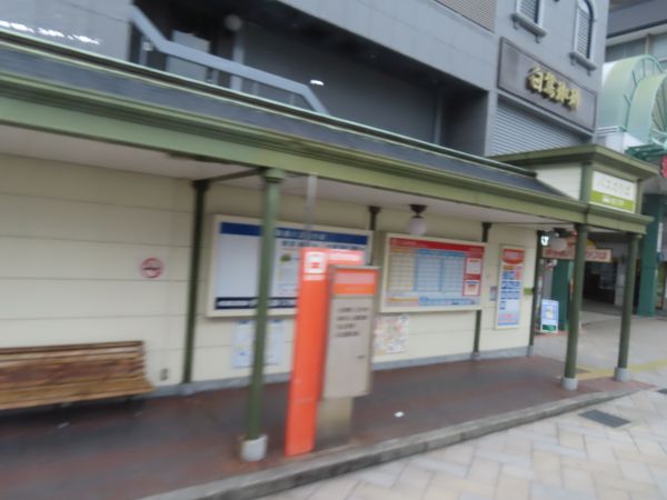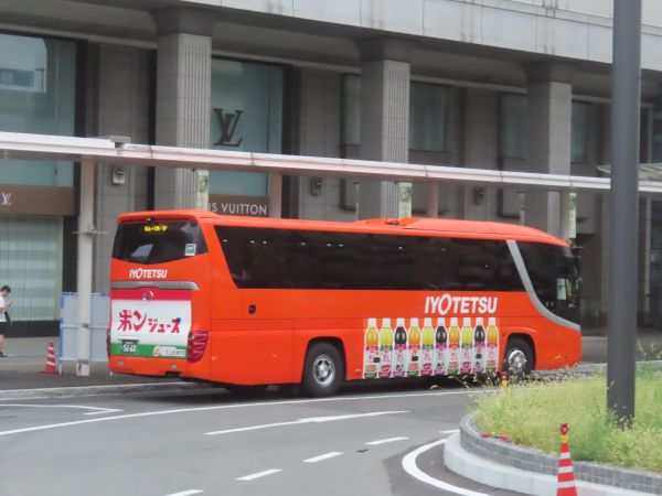 駅前には、7時10分発の大阪・京都行の伊予鉄バスが停車していた。ポンジュースのラッピングが施されていた。