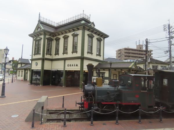 道後温泉停留場の引き込み線には「坊ちゃん列車」が停車している。
