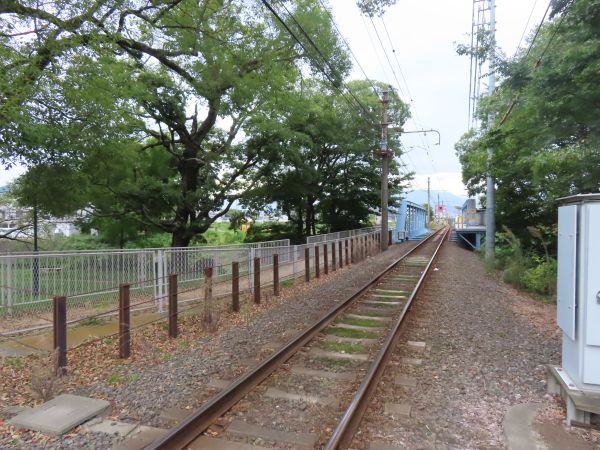 石手川公園駅は、石手川に架かる橋梁上に駅がある。