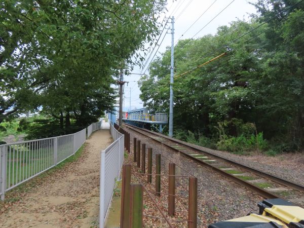 ホームは踏切から見えるが、駅の入口は、橋を渡った向こう側にある。線路の横にある歩道を進めばよい。