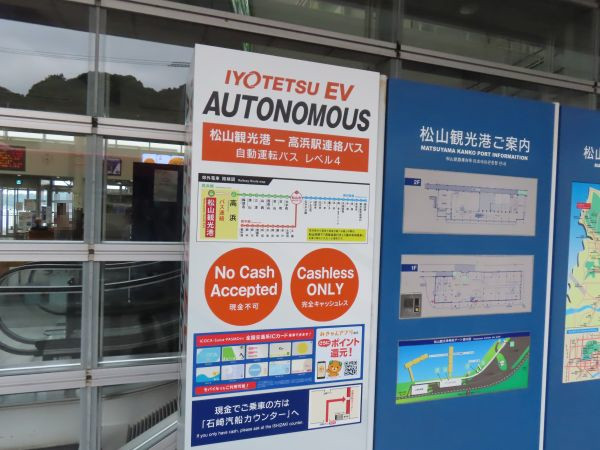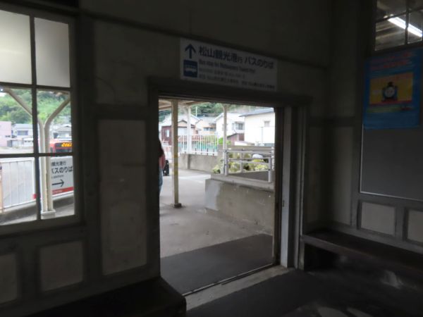 高浜駅の改札を出てすぐ右側、駅舎内に、松山観光港行バス乗り場への通路がある。連絡バスは列車に接続しており、次の便は8時21分発である。列車からバスに乗り換える客は一定数いる。
