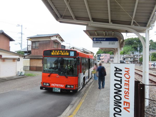 バスは、乗り換え客を待って出発する。松山観光港までは高浜駅から2分ほどである。