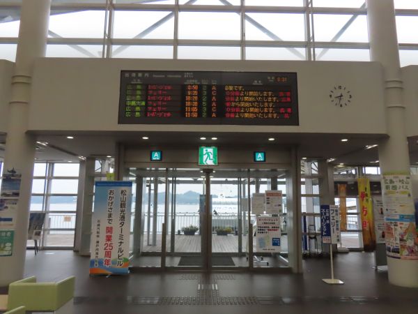 出発10分前に乗船開始となる。8時50分発の便は呉経由広島行きである。松山から呉までは48.8kmで所要57分、呉から広島までは17.4kmで所要23分で、広島到着予定時刻は10時10分である。
