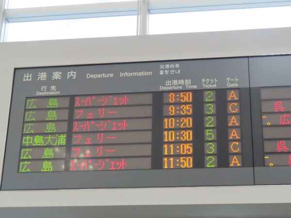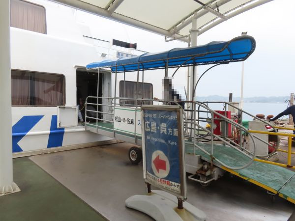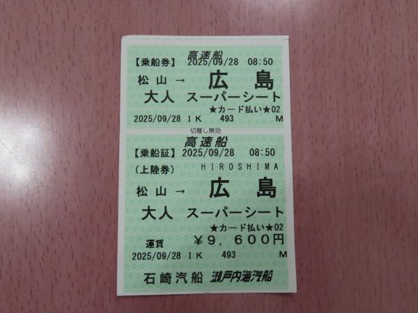 次の広島行きは、8時50分発の石崎汽船の高速船「スーパージェット」であった。こちらに乗船することにする。窓口で乗船券を購入した。広島まで8,800円である。なお、高速船には普通席とスーパーシートがあり、スーパーシートは2階で眺めも良いというので、追加で800円払い、スーパーシートにした。座席は自由席とのことである。