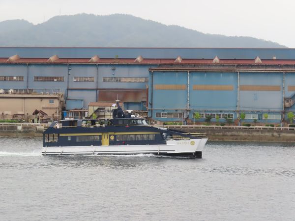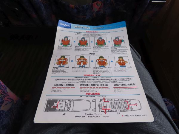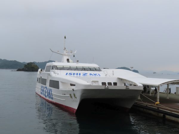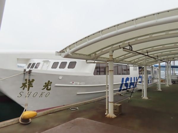 この便は石崎汽船のスーパージェット「祥光」による運行であった。スーパージェットは、東京大学、日立造船、瀬戸内クラフトが共同で開発し、1993年に登場した双胴型水中翼船である。総トン数189トンで座席数は156名と、比較的小型である。最高速度は32ノット(時速59.3km)とのことである。