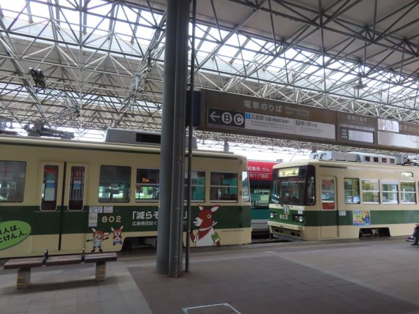 ターミナルを出ると、すぐ目の前に広島電鉄の路面電車の広島港(宇品)停留場がある。広島駅へは5号線で30分弱、紙屋町へは1号線で35分弱である。