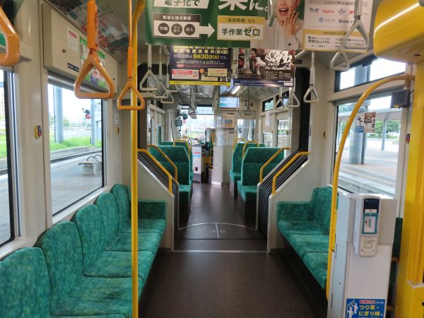 海岸通、宇品五丁目と進むにつれて、各駅で多くの客が乗車して、すぐに立ち客で通路まで埋まった。