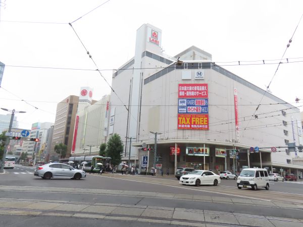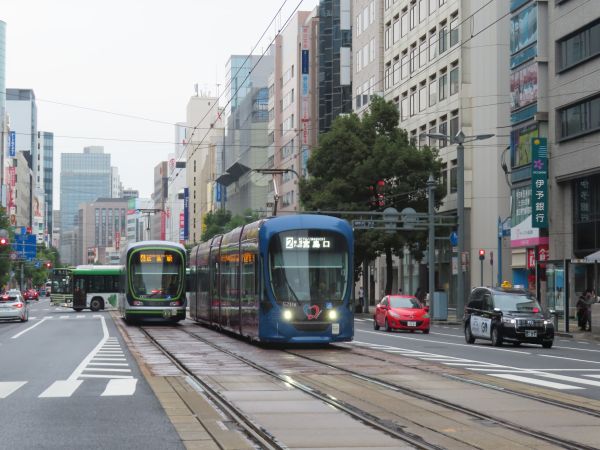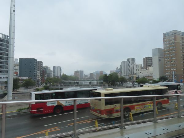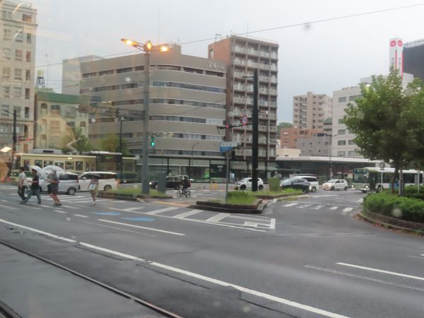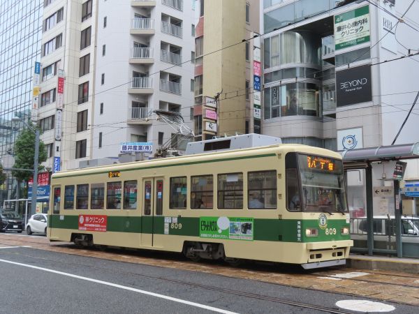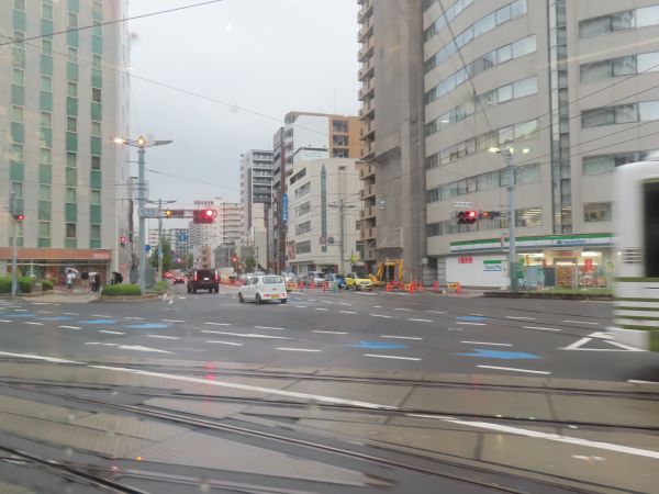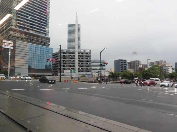 広電本社前、市役所前と進む。通りには商業ビルやホテルが並んでいる。