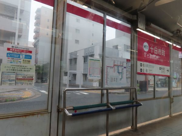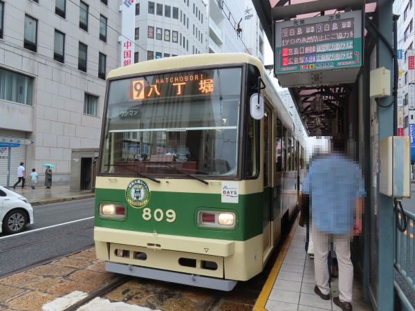 白島線との接続停留場である八丁堀には11時12分に到着した。ここで電車から降りた。「MOBIRY DAYS」を使用する場合はすべてのドアから降りることができるが、現金や交通系ICカードなどを利用する場合は運転手か車掌のいるドアから降りる必要がある。