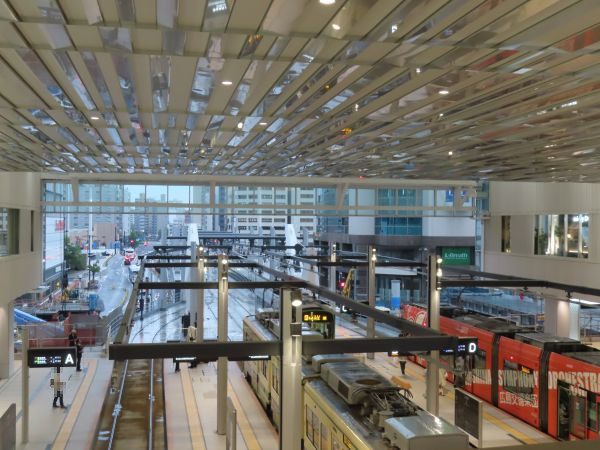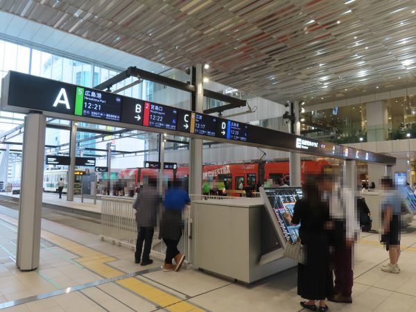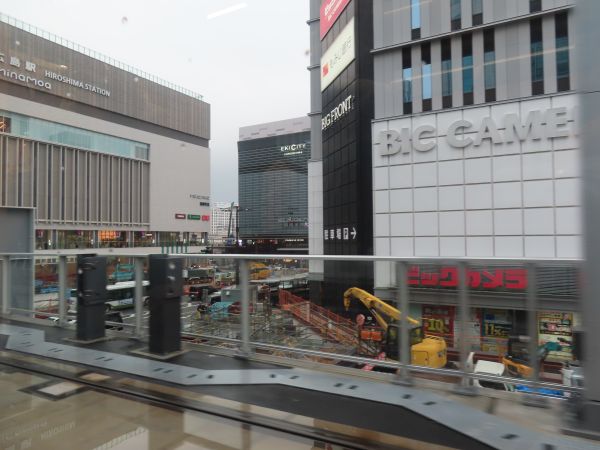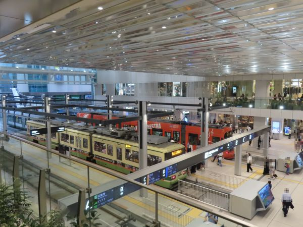 広島駅の駅ビル「ミナモア(minamoa)」の3階からは、停留場全体を眺めることができる(後程撮影)。