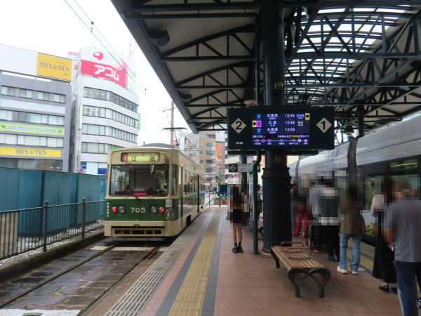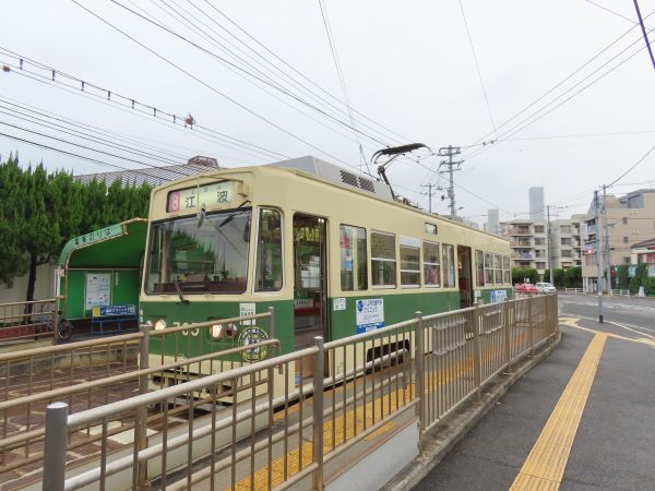 横川駅からは8号線で江波まで向かう。8号線は横川駅と江波を結ぶ路線で、横川駅から横川線で十日市町、本線で土橋、江波線で江波という経路をたどる。運転間隔はばらつきがあるものの、1時間に4本程度の運行である。