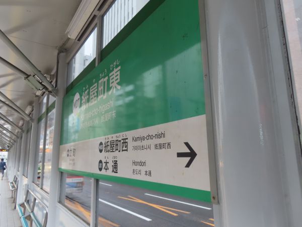 本通を出ると、右折して、次は紙屋町東に停車する。紙屋町停留場は西と東に分かれており、本線を直進する列車は両方の停留場に停車するが、1号線は東のみに停車する。