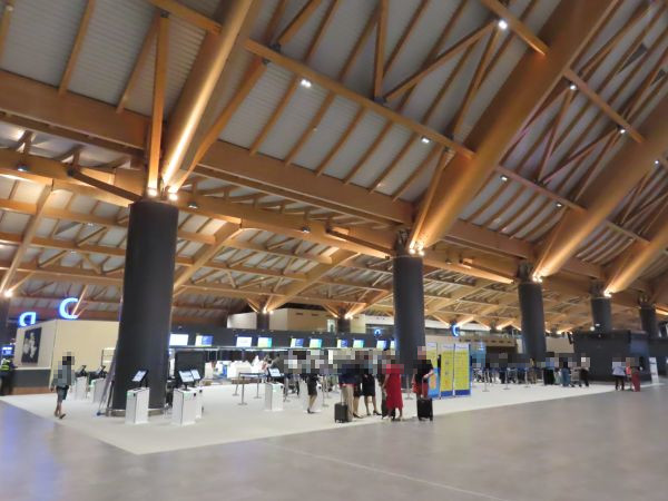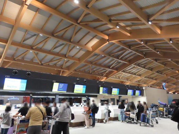 チェックインカウンターの前に自動チェックイン機があり、ここでチェックインを済ませる。荷物のタグも出てきて、これを持ってカウンターに並ぶ。先客は多くなかったが、大きな荷物を複数持っている人も多く、自分の順番が来るまで15分近くかかった。