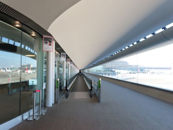 サテライトから本館へ向かう。2013年までは、本館とサテライトとの間はシャトルシステムで結ばれていたが、今はこのような通路になっている。