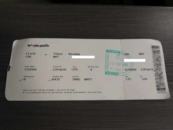 結局、Trip.comから、22日の朝5時20分にクラークを出るセブパシフィック航空5068便成田行きを予約した。受託手荷物1つをオプションで付けて、86,820円であった。Trip.comの割引が適用されたため、セブパシフィック航空で直接予約するより、僅かに安かった。