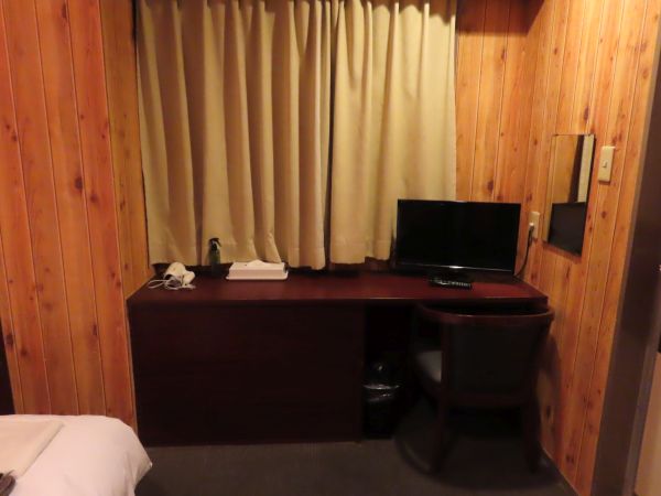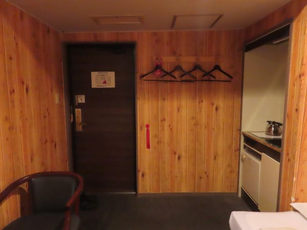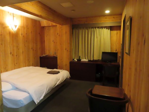 以前に宿泊した際は一般的なビジネスホテルのシングルルームといった感じであったが、今回の部屋は、木目調の壁の一風変わった造りの部屋であった。部屋に入ると、通路もなく、居室である。