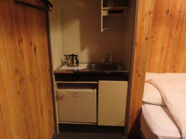 部屋に入ってすぐ左側には簡単なキッチンがあり、冷蔵庫も用意されている。