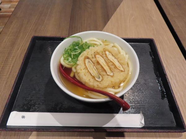 ごぼう天うどんを注文した。720円也。ごぼう天は、丸いかき揚げの中にごぼうが入っているというものであった。うどんは、博多の柔らかいうどんである。美味しくいただいた。