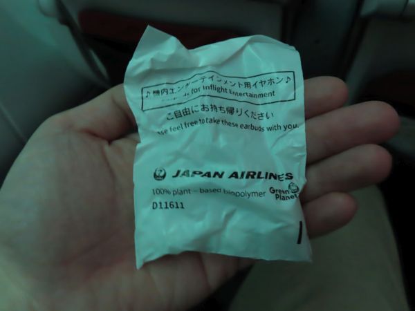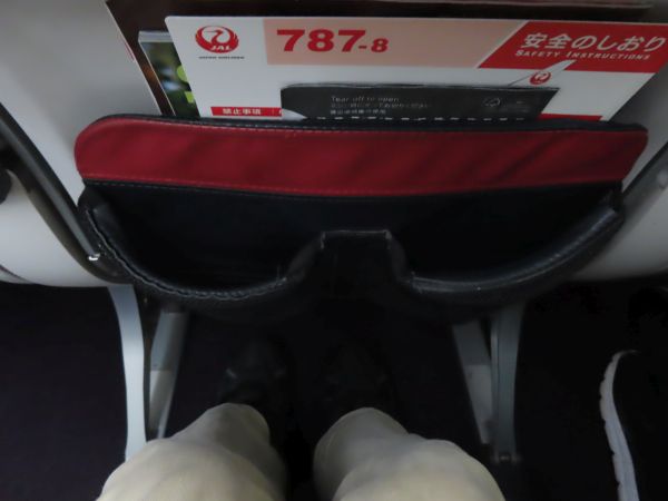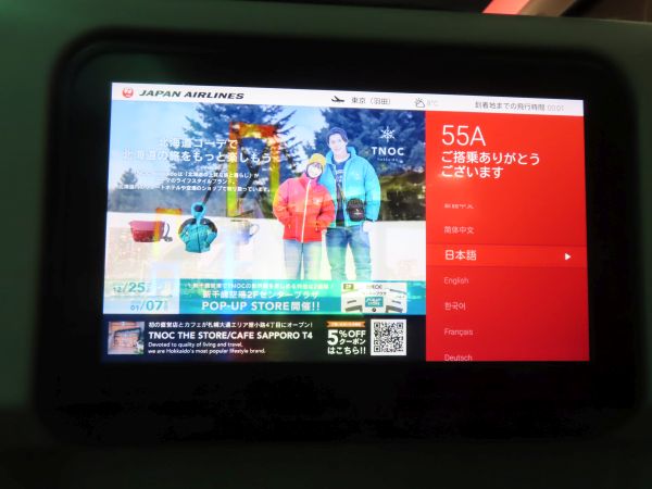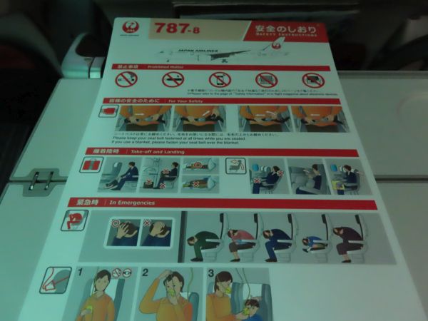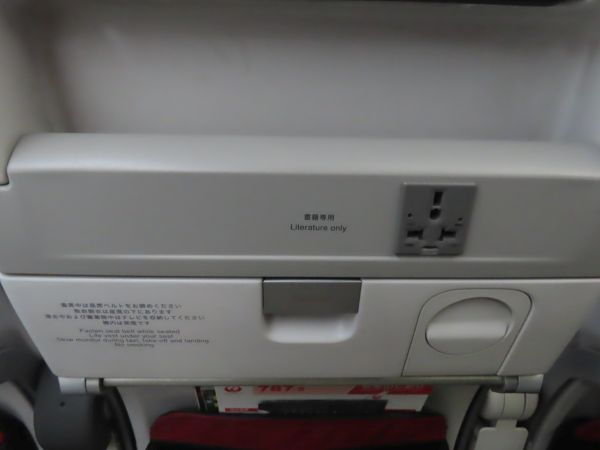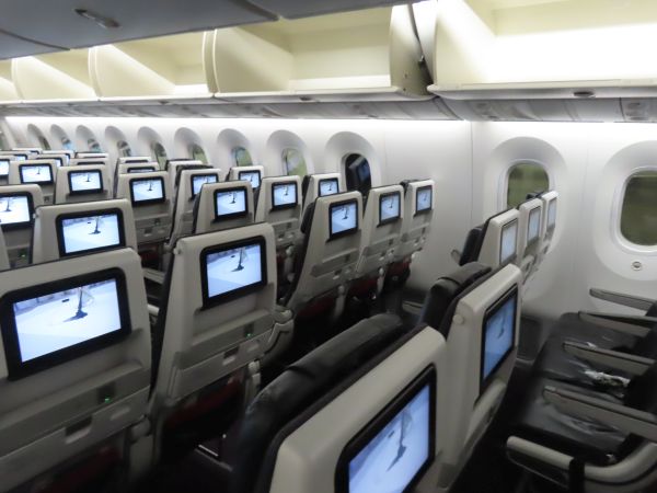 機材は国内線用のB787-8型機である。日本航空では、国際線普通席は2+4+2の横8列配置で、世界標準の横9列より1列少なくして差別化を図っているが、国内線は3+3+3の一般的な配置となっている。もっとも、全席に液晶モニターが備え付けられ、電源も設置されているなど、設備は良い。(後程撮影)