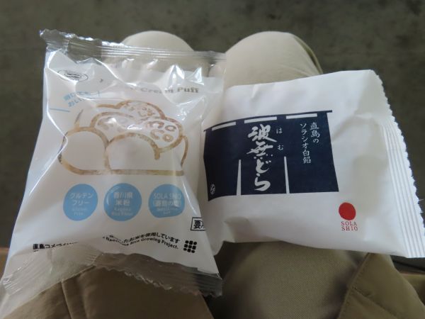 宮浦港に戻り、海の駅「なおしま」の売店で、「波無どら」とシューアイス「なおしまMOCOMOCO」を購入した。「波無どら」は白餡のどら焼きで、白餡には直島のソラシオが使われているという。「なおしまMOCOMOCO」もソラシオと直島の米が使われている。いずれも美味しくいただいた。ただ、シューアイスは、買ってすぐに開けたら、アイス部分がものすごく硬かったので、少し時間をおいてからの方が良かったようである。