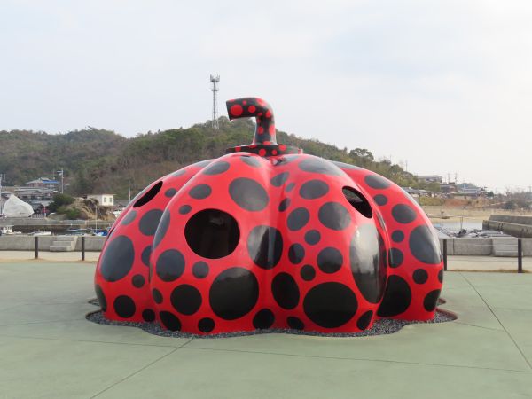 宮浦港の広場には、草間彌生氏の「赤かぼちゃ」が展示されている。中にも入ることができて、写真撮影の観光客で賑わっていた。
