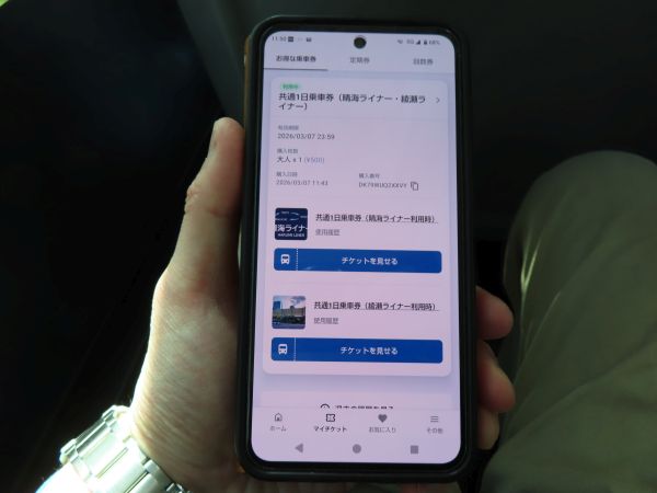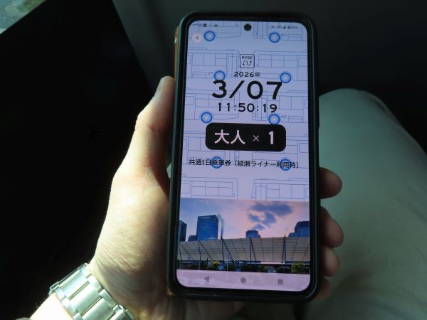 今回は、「綾瀬ライナー」「晴海ライナー」共通の1日乗車券を、スマホアプリ「RYDE PASS」から購入していた。500円也。