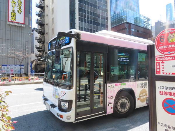 東京駅八重洲北口の停留所は、中央区のコミュニティバス「江戸バス」と同じところにある。「綾瀬ライナー」は、降車も乗車もこの停留所である。また、この後に乗る「晴海ライナー」も、東京駅付近では循環運転を行っており、晴海発便も晴海行き便もこの停留所を使う。