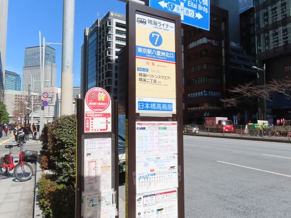 日本橋高島屋でも降車客はおらず、通過する。ここは、東京駅と晴海地区を結ぶ「晴海ライナー」も停車するので、独自の停留所が用意されている。