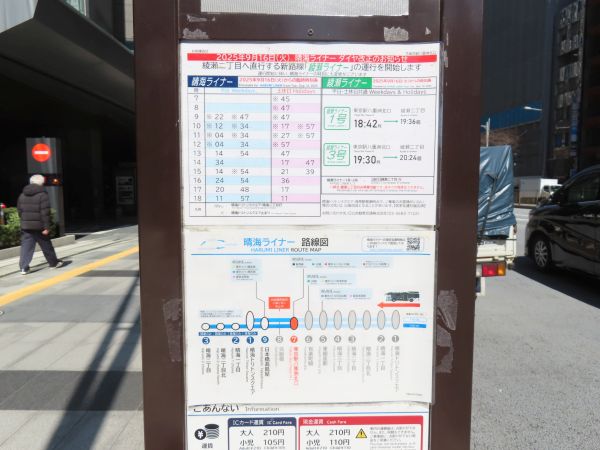 まず「綾瀬ライナー」であるが、綾瀬発の「綾瀬ライナー」は、平日と土休日で若干時間が違うが、午前中に1日3便の運行である。始発は綾瀬二丁目で、乗車可能なのはこの停留所だけである。綾瀬二丁目を出ると、都営浅草駅、上野駅、新日本橋駅、日本橋髙島屋に停車する。平日の朝1便(2号)だけは日本橋高島屋を出ると晴海トリトンスクエアへ向かうが、その他の便は、東京駅八重洲北口に向かい、そこが終点である。所要時間はおよそ1時間である。