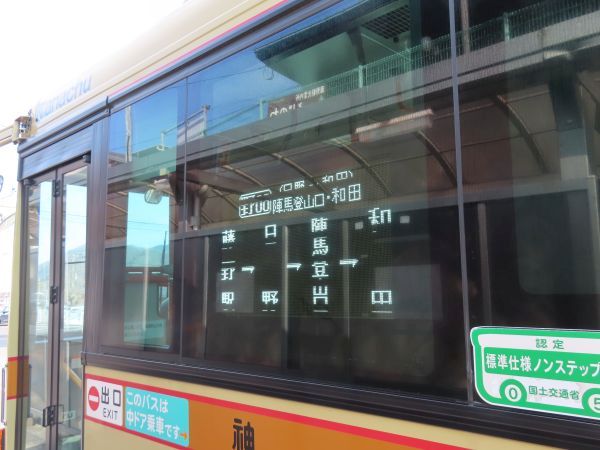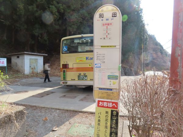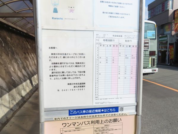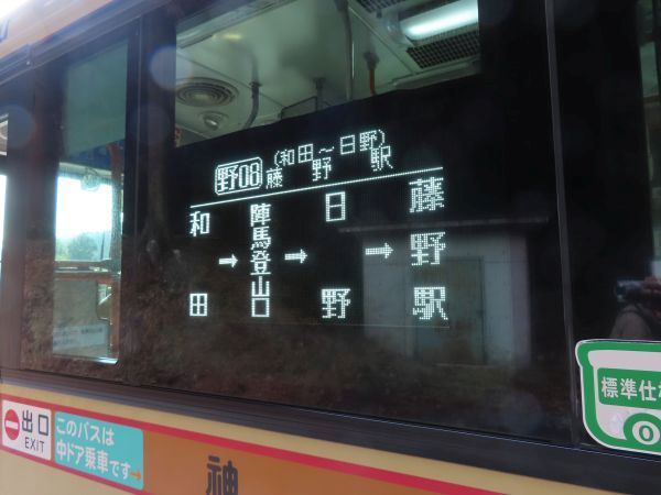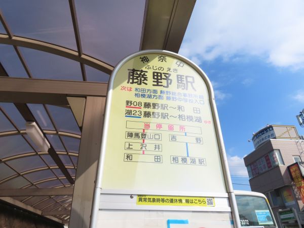 まずは、「野08」系統で和田まで向かう。藤野駅から見て和田は北方向にあり、藤野駅から和田までは約5km、所要時間は15分弱である。平日1日7本、土休日は1日8本設定されている。