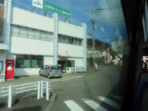 踏切を渡ると、藤野総合事務所前の停留所がある。この路線は、道幅が狭いところを通るからだろうか、すべて確認できたわけではないが、停留所のポールが片側1本しかない例が多い。