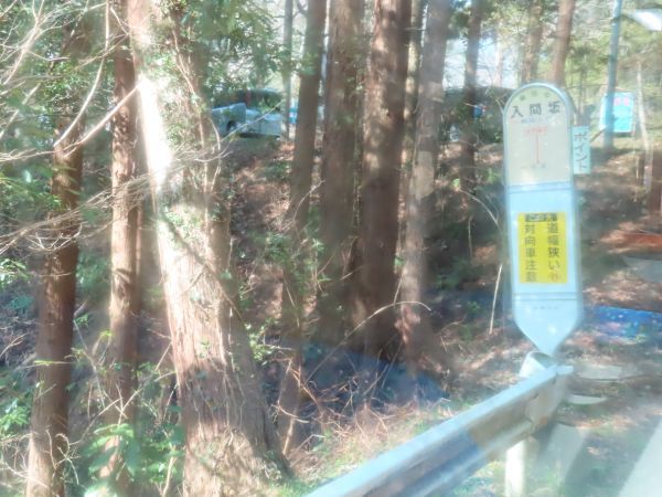 入間坂停留所には「道幅狭い 対向車注意」の文字がある。