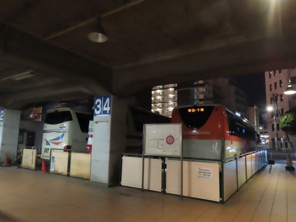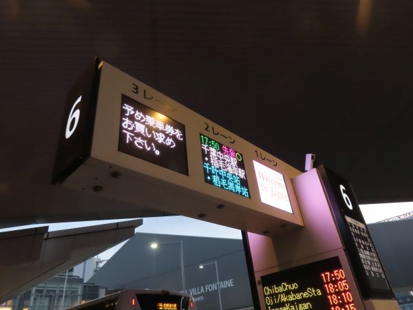 ここまで乗車してきたバスは、おそらく車庫に向かって出発していったが、ここにもバスの待機場があり、東京空港交通、京浜急行バス、京成バスが停車していた。羽田空港行きのバスは、この後、19時25分、20時、20時30分と続き、最終は22時である。これらのバスが順次充当されるのだろう。