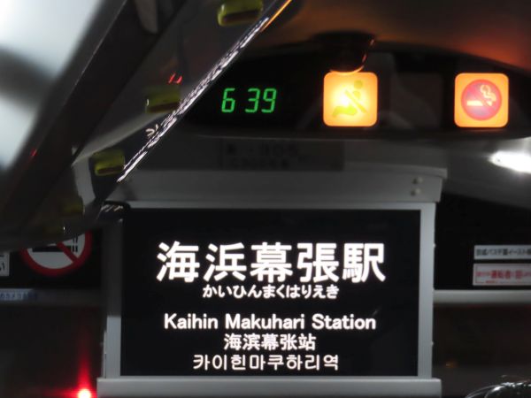 海浜幕張駅には18時39分に到着した。国際大通り沿いに停車する。ここでまとまった降車がある。