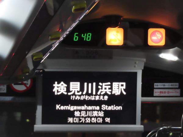 幕張ベイタウンを過ぎて住宅街が途切れると、辺りは一気に暗くなり、花見川を渡る。再び灯りが見え、検見川浜駅には18時48分に到着した。京葉線との接続駅である。