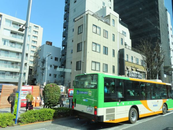 この区間では都営バスも多く運行しているが、都営バスの方は晴海通り沿いに多数の停留所があるのに対し、こちらは日本橋高島屋を出ると晴海トリトンスクエアまで無停車である。混雑の程度も、都営バスは立ち客も多いが、こちらは客は多いものの、立っている客はいない。